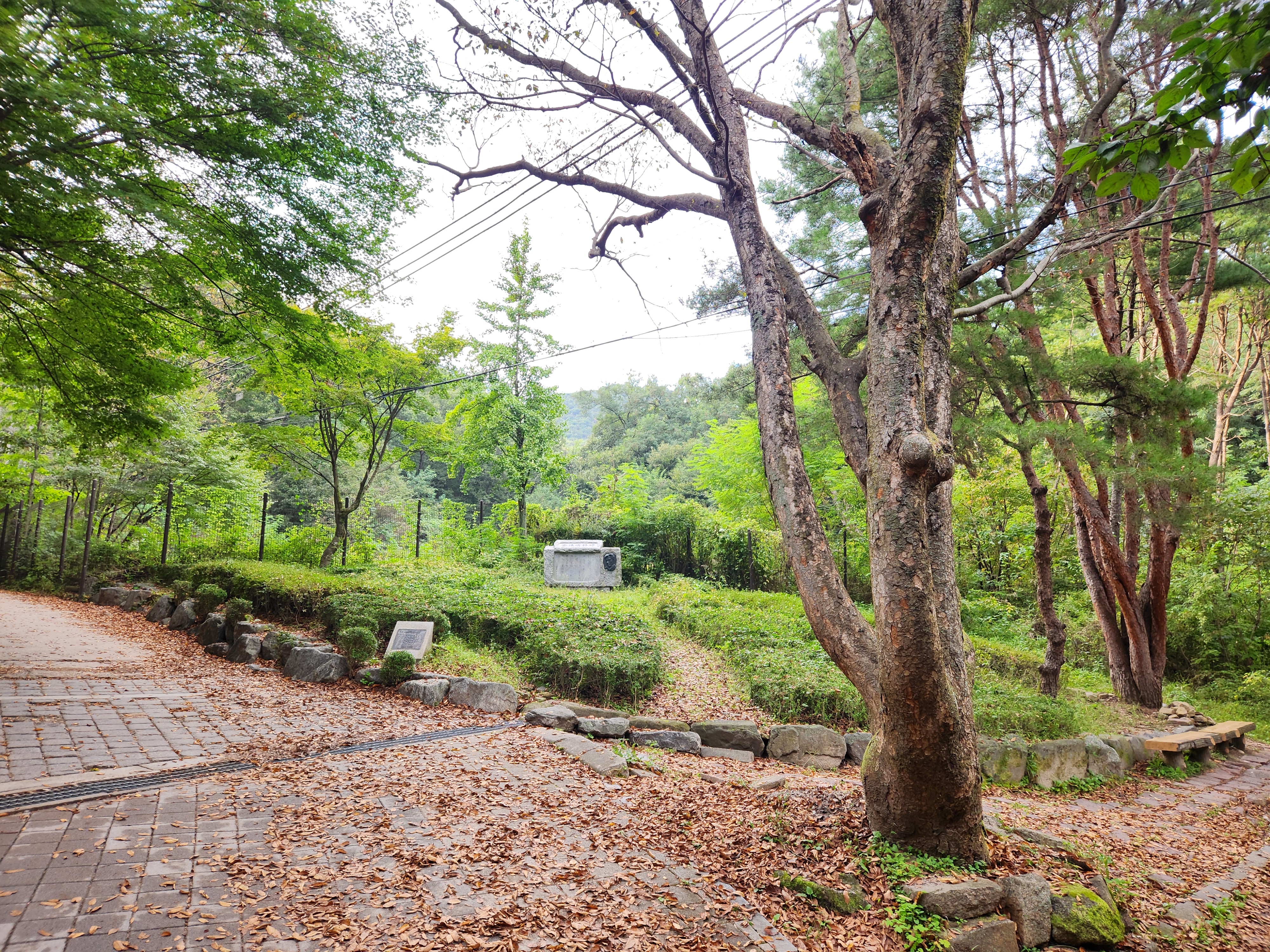 김수영시비 앞 줄기가 여럿으로 갈라져 자라고 있는 느티나무와 소나무..